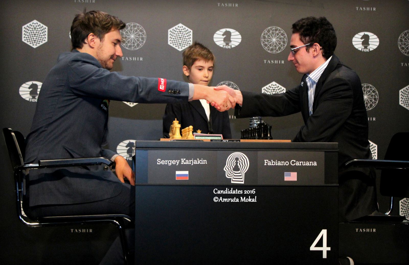 Handshake signalling the start of the most important game of the final round. The next handshake between them will decide who the challenger to Magnus Carlsen would be. Note the smile on the faces of both the players. The stakes are high, but camaraderie still exists!