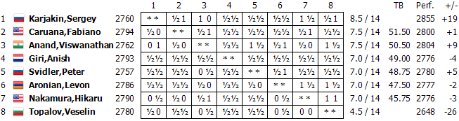 This was the second most important game of the day as its result could have had a big impact on Karjakin and Caruana's decisions in their game. Svidler, as usual, began with the English Opening. This time Anand opted for the more solid 6...Re8 rather than 6...e4. Svidler's manoeuvre with Ne1-c2-e3 looked a tad time consuming, and already after the opening Black had equalized. Anand had no real problems to hold the game and thus Vishy fiished third.