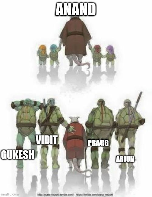 Anand remained India's top player until the ripe age of 53. In August 2023 Gukesh overtook him in the rating list, advancing to number eight in the world. And there are a couple more from our training camp above who are poised to join him at the top. Here's a meme that nicely visualizes what is in store:
