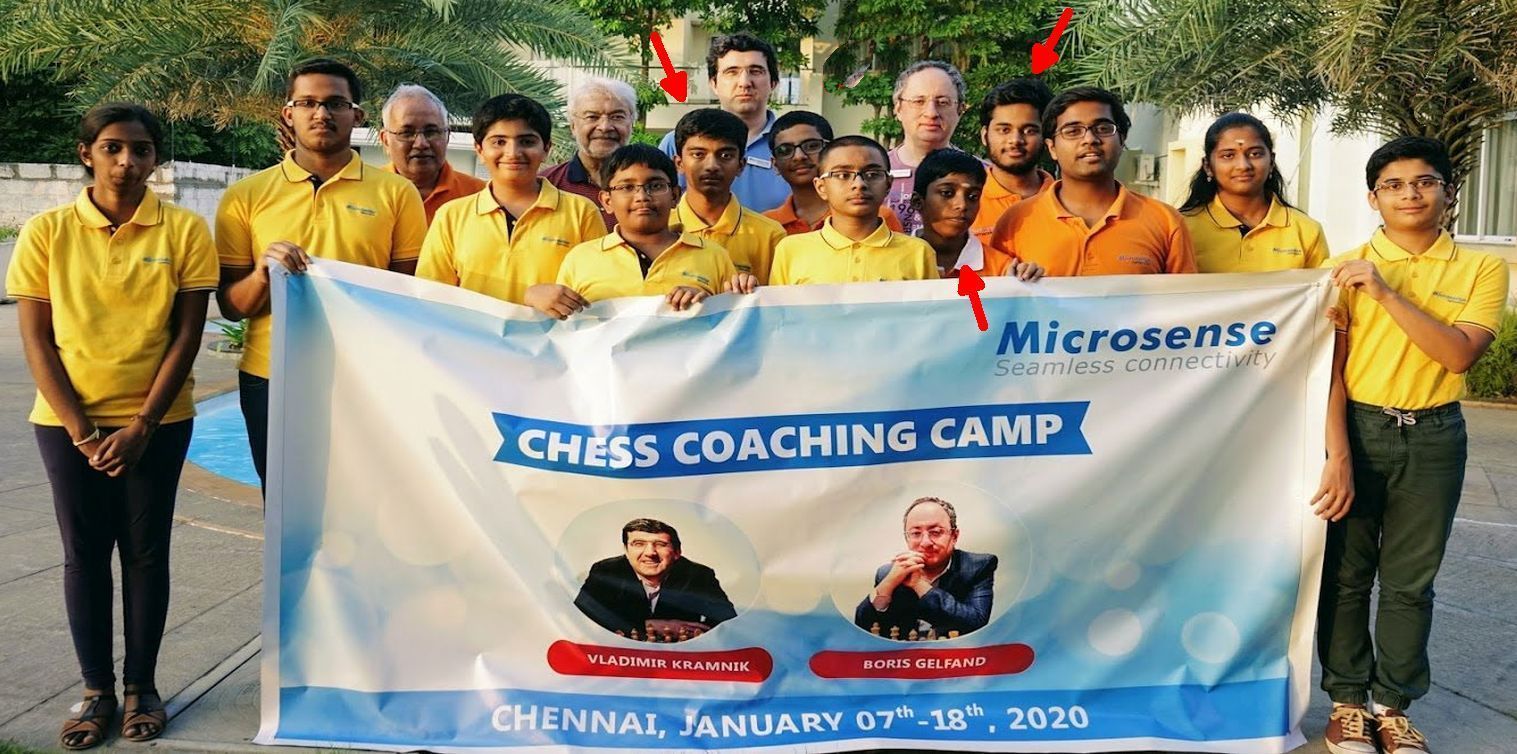 Gukesh, Pragg and Arjun amid a magnificent group of talented Indian youngsters during a 2020 training camp with Vladimir Kramnik, Boris Gelfand and ChessBase's chief editor emeritus Frederic Friedel!