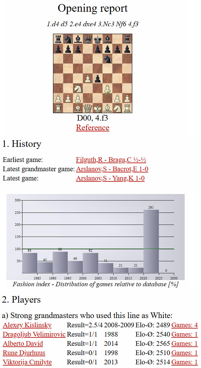 Originally it was Armand Blackmar who introduced the basic idea of the gambit, in the 19th century. But his advocacy of 1.d4 d5 2.e4 dxe4 3.f3 turned out to be unsound, as it allowed Black to equalize quite easily. Diemer refined the opening by introducing an important move-order twist: he recommended playing 3.Nc3 before offering the pawn with f3 on move four, which made the gambit far more playable. In ChessBase you can use the Report tab and run an "Overview" to learn everything about history, the strong grandmasters and other notable players who used the gambit, statistics, moves and plans:
