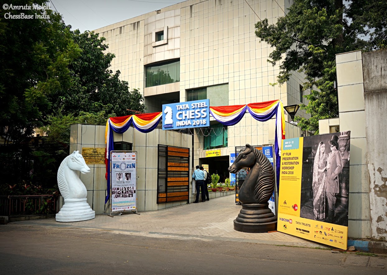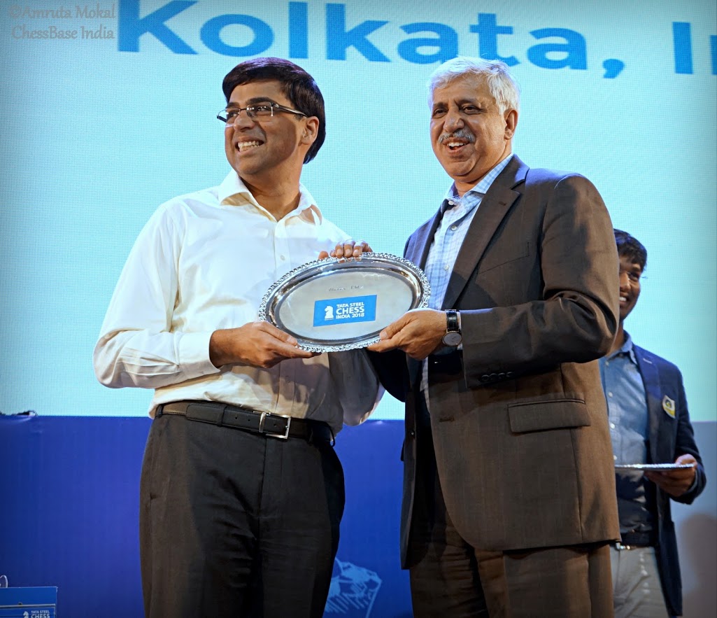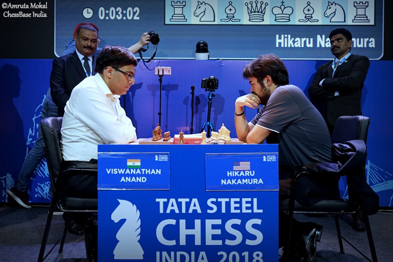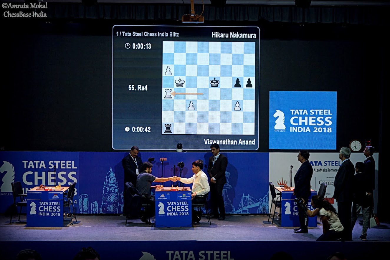 11/16/2018 – The strongest chess event on Indian soil was held from November 9th to the 14th, 2018 with three days of rapid chess and two days of blitz. Hikaru Nakamura had already won the rapid section with a dominating performance. In the blitz event, the American GM was racing ahead on the first day with 6½/9. It seemed as if Nakamura would take home both the titles, but Vishy Anand had other plans. The 48-year-old former World Champion showed his class as he notched up one win after another. By scoring 7½/9 on day two he tied with Nakamura for the top spot. We then had a blitz playoff in which Anand triumphed and won the Tata Steel Chess India Blitz 2018. IM SAGAR SHAH and AMRUTA MOKAL provide pictures, videos, game analysis from Kolkata.
