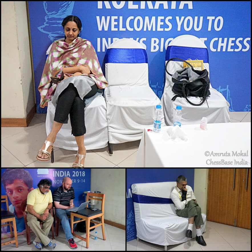 The support team — Aruna for Vishy Anand, Sunil Weeramantry and Kris Littlejohn for Nakamura and Ramesh for Praggnanandhaa | Photo: Amruta Mokal