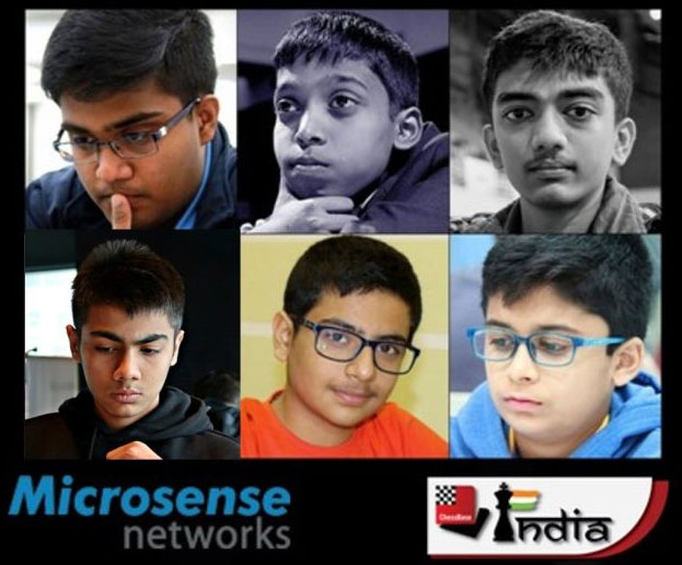 Six of India's brightest talents will train with 14th World Champion Vladimir Kramnik (clockwise from top left): GM P. Iniyan (2517), GM R. Praggnanandhaa (2569), GM D. Gukesh (2528), IM Leon Mendonca (2401), IM Raunak Sadhwani (2493) and GM Prithu Gupta (2493)