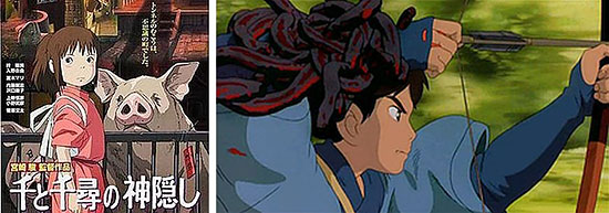 On the left: a poster of the 2002 Oscar winner ’Spirited Away’; on the right: a still from ’Princess Mononoke’