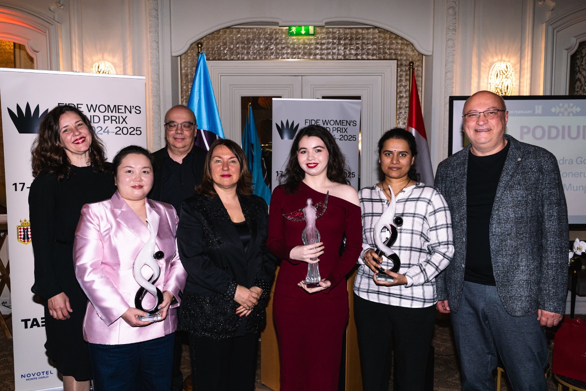 Following two eventful final rounds, three players finished tied for first place at the Women's Grand Prix in Monaco. Aleksandra Goryachkina, Batkhuyag Munguntuul and Humpy Koneru each scored 5½ points, sharing the top spot in the tournament. Based on tiebreak criteria, Goryachkina was declared the official tournament winner, having played more games with the black pieces and achieved a superior Sonneborn-Berger score.