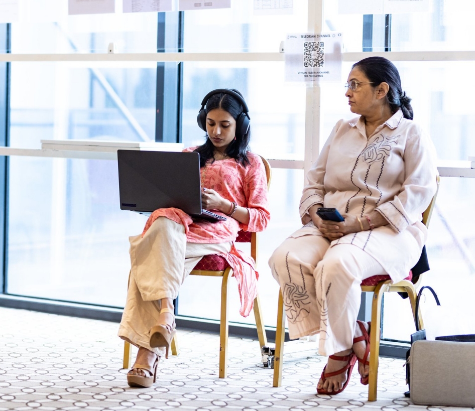 Divya Deshmukh with headphones, laptop and her mother by her side, offering strong support throughout the tournament | Photo: Anna Shtourman