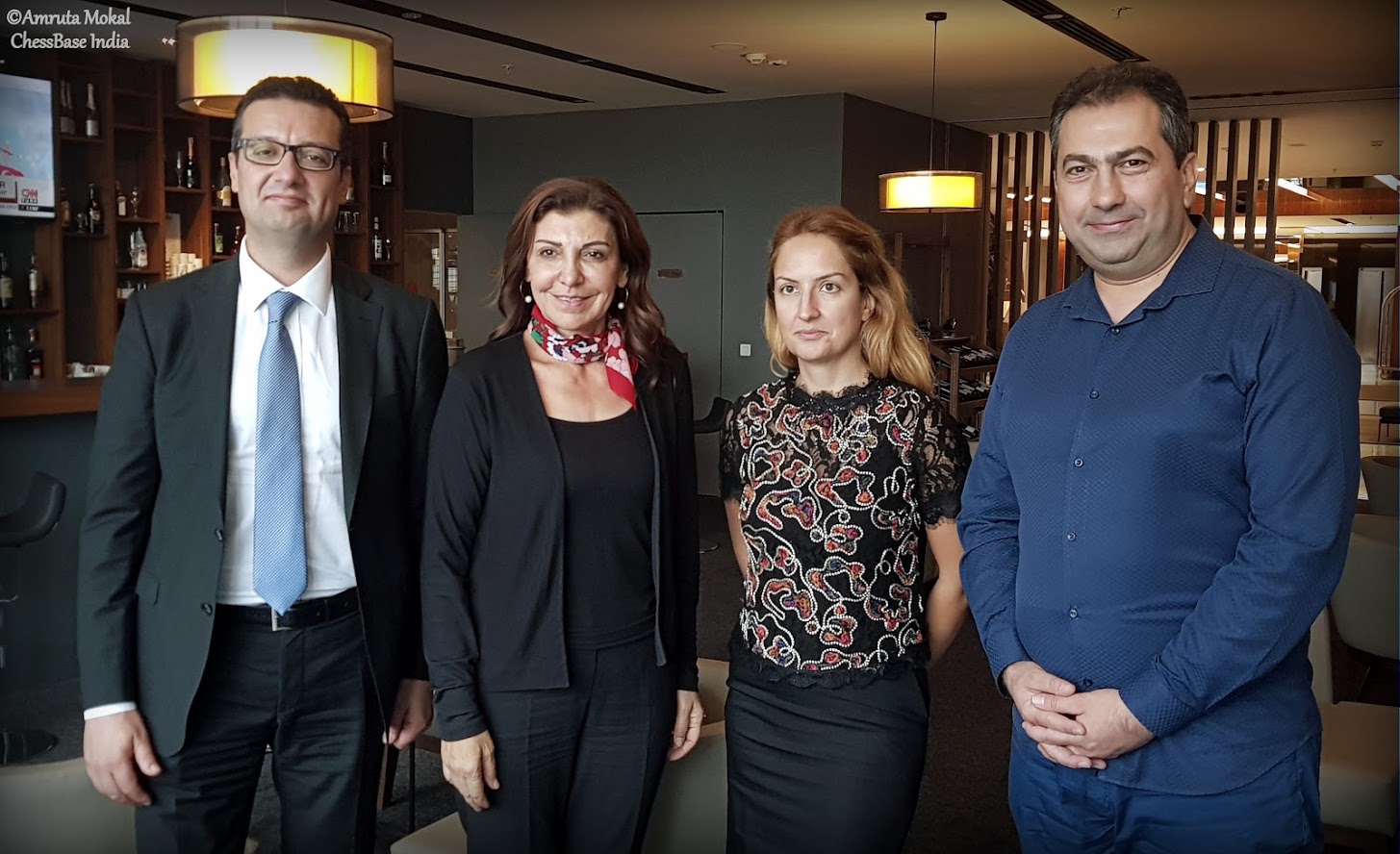 Turkish Chess Federation officials Gulkiz Tulay and Ozgur Solakoglu with the long-standing (13 years!) sponsors of the Turkish Chess Federation — Türkiye İş Bankası. Bulent Yumusaker (left) Division head visited the tournament venue. | Photo: Amruta Mokal