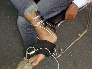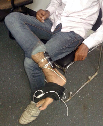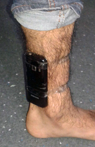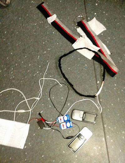 The batteries were connected to a loop of wire around his neck, hidden under the shirt. They were also connected to the phones strapped to each foot, just above the ankle. The player also carried two spare batteries in his bag, presumably for the next round.