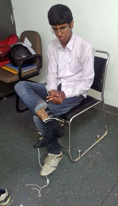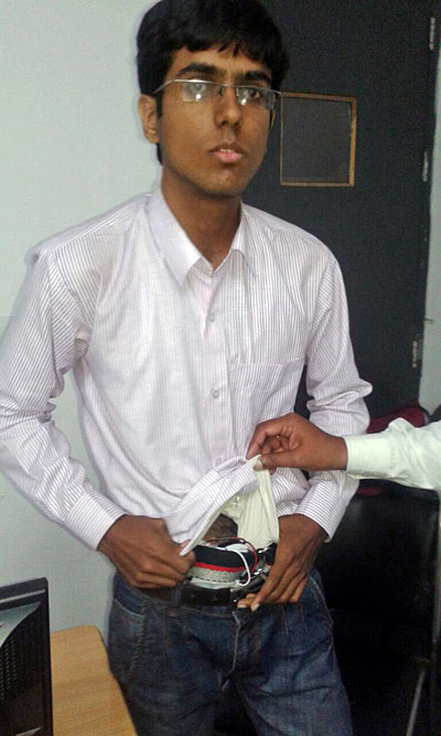 "I made this device and practised with my friend for three days before using it in this event" he said. Apparently his collaborator would dictate possible moves made by my opponent and Lallar would tap his foot when the correct move by Thipsay came up. Fritz would then calculate a reply, which Shubham would read out and Kakkar would play.